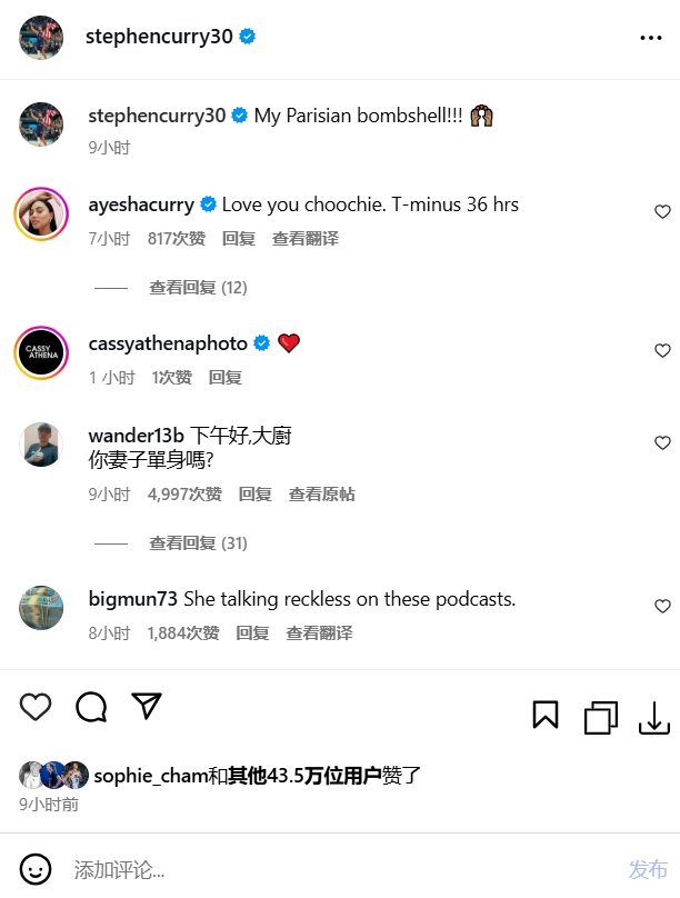 视频解馋?库里晒阿耶莎腿照:我的巴黎炸弹😚