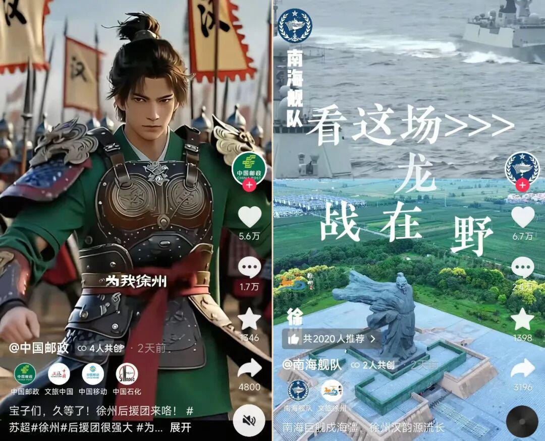 据不完全统计,抖音上已有@中国邮政 @文旅中国 @中国移动 @中国石化 @南海舰队 等重量级账号在这场比赛前为徐州队应援,无论是从文化意义还是物理意义上来说,都堪称实力强劲: